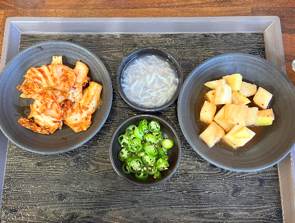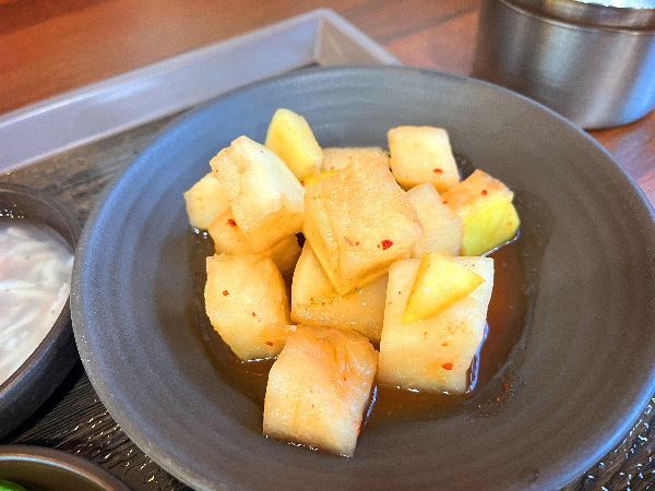 고춧가루가 거의 묻어있지 않은 국물 깍두기입니다. 하얗게 보이지만 깍두기 무 자체에 맛이 잘 배어있어서 너무나 맛있었습니다. 고춧가루 때문에 텁텁하거나 과한 맛이 없이 시원하고 깔끔한 맛이 나는 것 같았습니다.