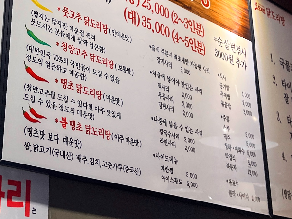평일 저녁시간이었지만 만석으로 10분정도 대기하였습니다. 입간판을 보니 2~3인분 25,000원 4~5인분 35,000원으로 비교적 가격이 괜찮은 것 같았습니다. 맵기 조절도 가능하고 맛이 기대가 되었습니다.