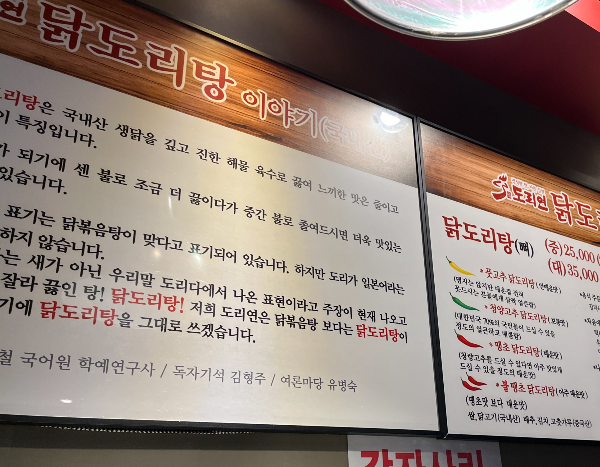 메뉴 옆에 닭도리탕 어원에 대해서 설명이 있었는데요. 닭도리탕은 도리가 일본어 새에서 온 것이라는 주장 때문에 문제가 되어 닭볶음탕이라는 말을 새로 만들어서 현재까지 사용하고 있다고 합니다. 하지만 도리연 닭도리탕 이야기에서는 도리는 일본말 새가 아닌 우리말 도리다(둥글게 베다)에서 나온 표현이라고 생각되어 닭도리탕 그대로 쓴다고 하네요. 알고 먹으면 더 맛있습니다. 알쓸닭잡.