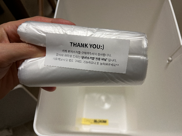 구입 감사의 의미로 분리수거함 전용 비닐도 받았습니다. 쓰레기통 3개를 한 세트로 판매하고 있었는데요. 저는 1개만 주문해서 서비스 없을 줄 알았는데 감사하게 잘 받았습니다.