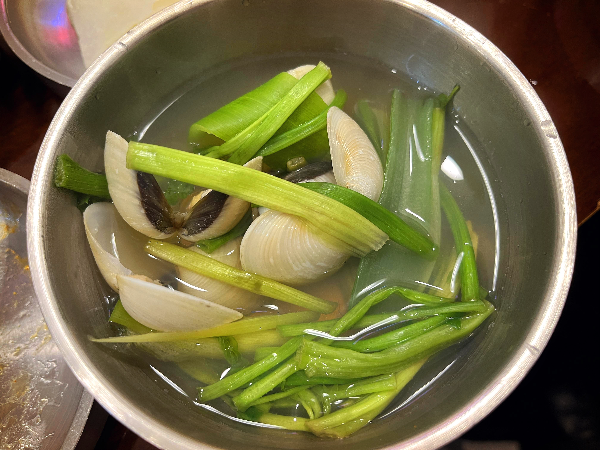 백합탕입니다. 메뉴판 사진에 보이는바와 다르게 실물은 그릇이 조금 작게 느껴졌습니다. 그래도 그릇이 작다보니 백합과 미나리의 양이 많아보이고 그만큼 적은 양의 국물이 굉장히 시원했습니다.