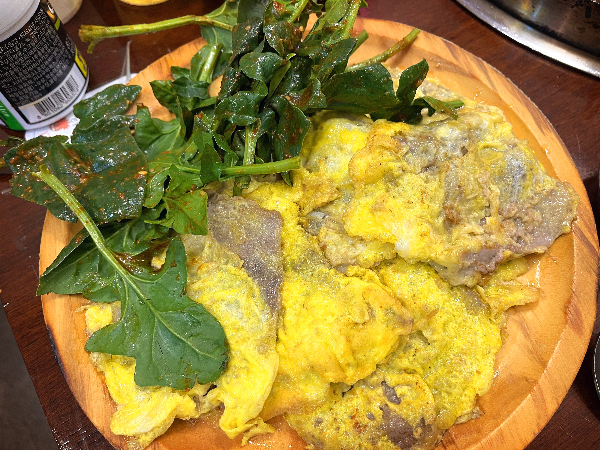 같이 나온 시금치에 싸 먹어보았습니다. 그냥 먹었을때는 기름의 느끼함이 조금 있었지만 시금치랑 같이 먹으니 담백함이 생기고 고기의 맛은 없어졌습니다. 육전 자체로 먹다가 느끼할때쯤 시금치 한번 먹는게 더 맛있었습니다.