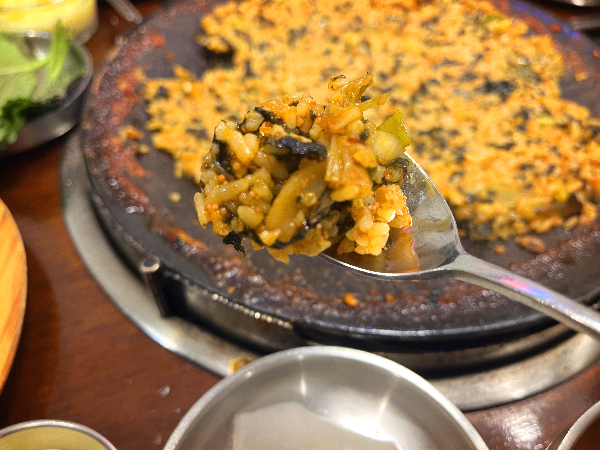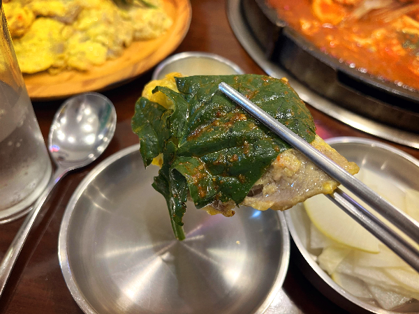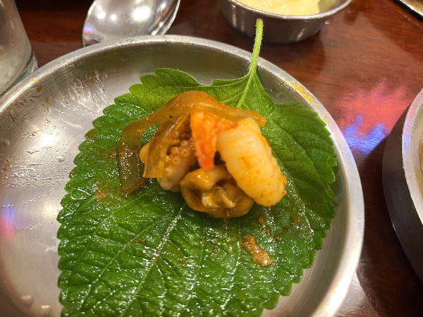 맵찔이라서 매운맛을 중화시켜주는 깻잎에 싸 먹어보았습니다. 깻잎의 향이 강해서 쭈곱새의 맛이 잘 안 느껴질 것 같았지만 쭈꾸미의 쫄깃함으로 입안에 계속 남아있어서 매콤하면서 고소한 맛이 좋았습니다.