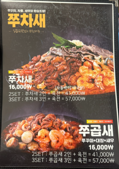 메뉴 선정은 쭈꾸미 같이 생긴 친구가 쭈꾸미 먹고 싶다고해서 결정되었습니다. 쭈곱새 3인과 육전이 나오는 쭈곱새 3인세트를 주문하고
