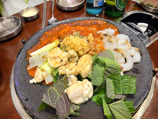 쭈곱새 3인세트가 나왔습니다. 대창과 새우가 보이고 깻잎 조각들과 양념이 한쪽으로 쏠려 있습니다.
