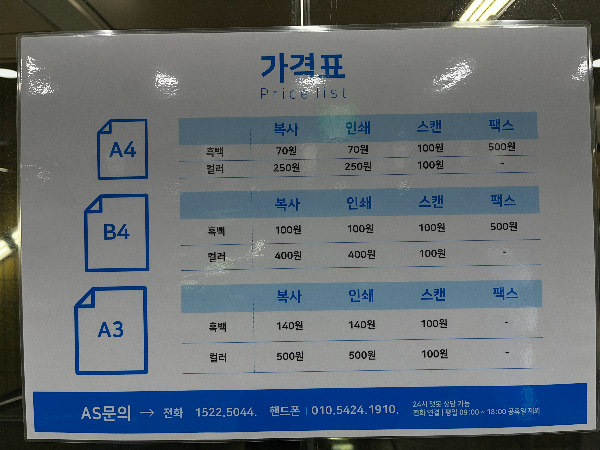 이용하기 전에 가격표도 확인해보았습니다. 용지 크기에 따라 용도에 따라 색상에 따라서 가격이 조금씩 달랐습니다.