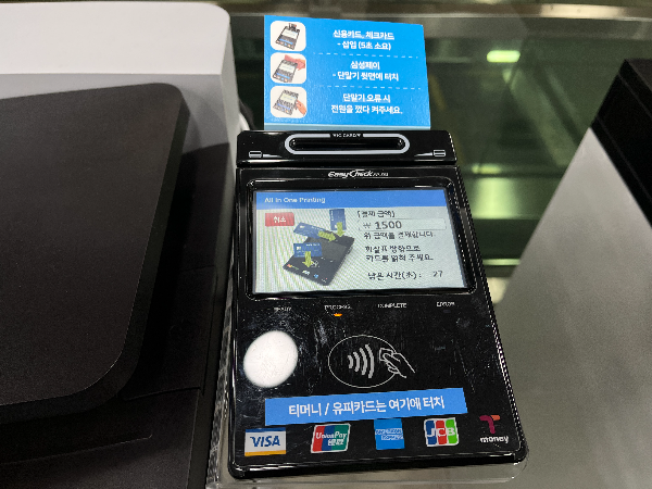 프린터기 오른쪽으로 바로 결제 단말기가 붙어있습니다. 저의 결제 금액 1,500원이 나와있어서 바로 결제합니다.