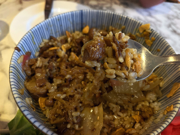 불향이 가득한 고기와 살포시 올려있는 달걀노른자 그리고 생강과 마늘후레이크가 있습니다.