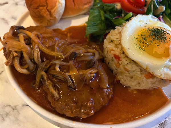 함박스테이크입니다. 모닝빵과 샐러드 그리고 볶음밥에 계란프라이가 올려져 있습니다. 함박스테이크 뿐만아니라 여러 음식이 조화롭게 있어서 너무 좋았습니다.