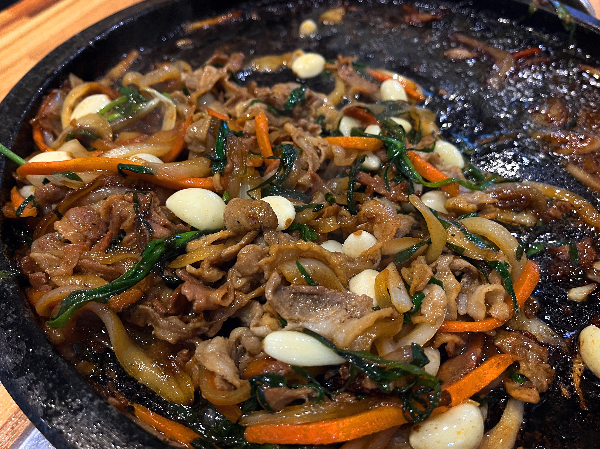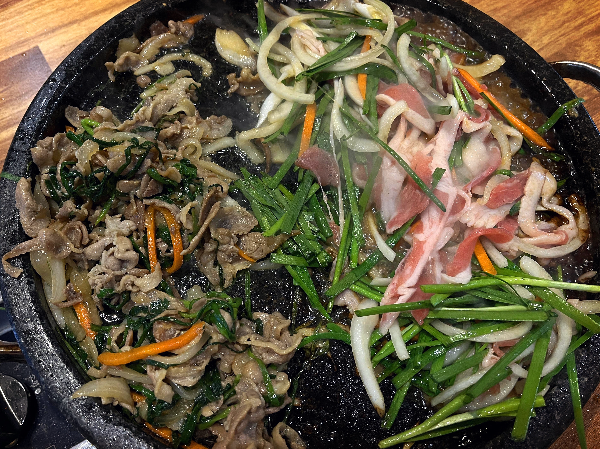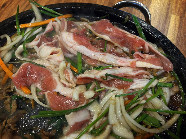 먼저 오리야채불고기입니다. 3분의 1 정도의 양을 뜨거운 불판에 올려주었습니다. 특재 양념 소스로 맛을 냈다고 하는데요. 오리가 익으면서 달달한 냄새가 났습니다.