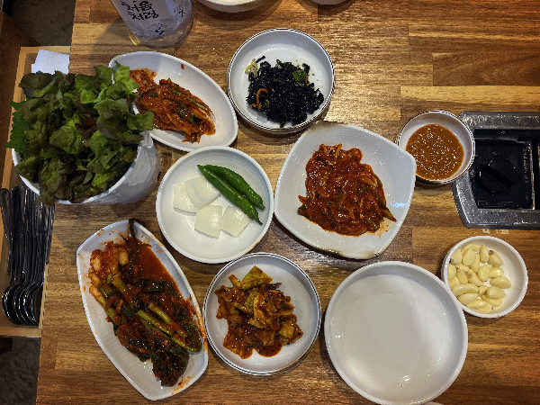 밑반찬이 먼저 나왔습니다. 김치 종류가 3가지나 됩니다. 기본 배추김치에 파김치 그리고 양배추로 만든 김치까지 다양했습니다. 기름이 많은 오리에 잘 어울릴 것 같았습니다.