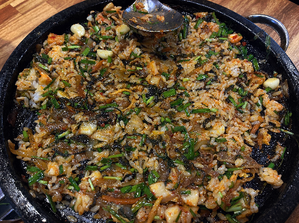 마지막으로 날치알볶음밥입니다. 적당히 남은 오리야채불고기에 밥을 볶아주셨습니다.