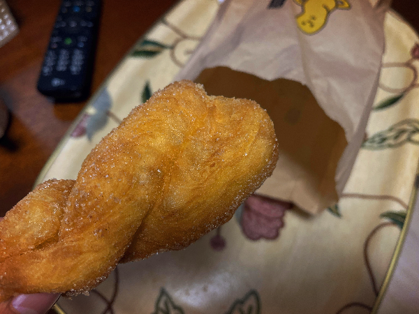 바삭하게 튀겨진 꽈배기에 설탕이 많지도 적지도 않게 적당히 묻어 있습니다. 냄새는 계피향으로 시나몬가루도 같이 묻어 있는 것 같았습니다.