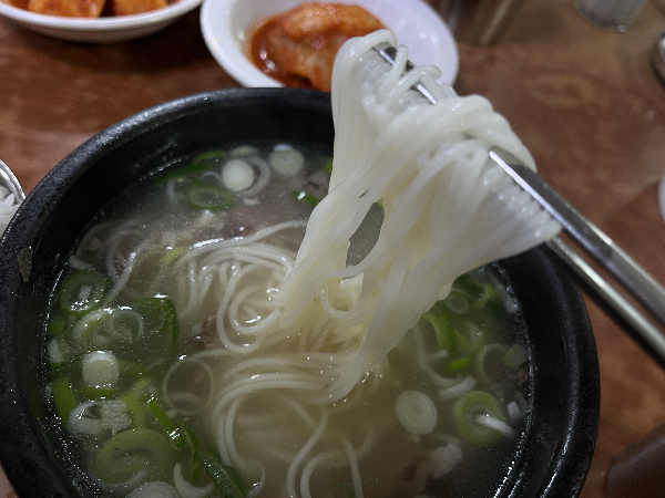 뽀얗고 맑은 육수인데요. 뚝배기에 나왔지만 팔팔 끓는 온도가 아닌 뜨겁지 않게 뜨끈하게 먹을 수 있는 적당한 온도로 나왔습니다.