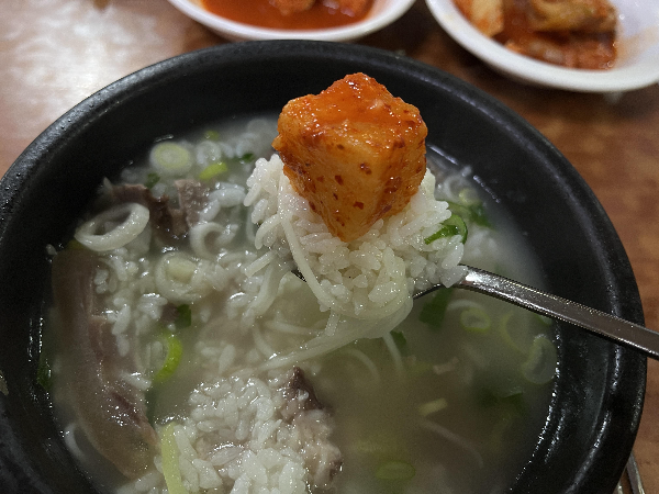국밥 한숟가락에 깍두기를 얹어서 먹으면 한뚝배기 뚝딱입니다.