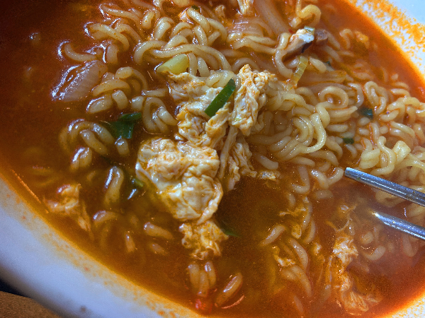 요즘 물가가 많이 올랐다고 라면에 계란이 안들어간 곳도 많은데요. 얌샘라면에는 계란이 풀어져 있어서 좋았습니다.