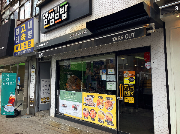 얌샘김밥 남영점입니다. 남영역 1번출구 건너편 다이소 옆 건물 쪽에 있는데요. 점심시간에 라면과 김밥이 먹고 싶어서 찾아오게 되었습니다.
