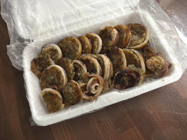포장된 오징어순대를 집으로 가져왔습니다. 김밥 도시락 용기에 포장되어 있습니다.
