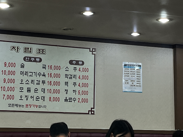 벽면에 있는 메뉴판입니다. 순대국도 먹고 싶었지만 집에 있는 아내 분과 같이 먹기위해 오징어순대만 포장으로 주문하였습니다. 모든메뉴는 포장가능하지만 순대국은 가게에서 먹고 싶어서 다음에 방문하기로 하였습니다. 오징어순대 2인분을 주문하고 기다려봅니다.