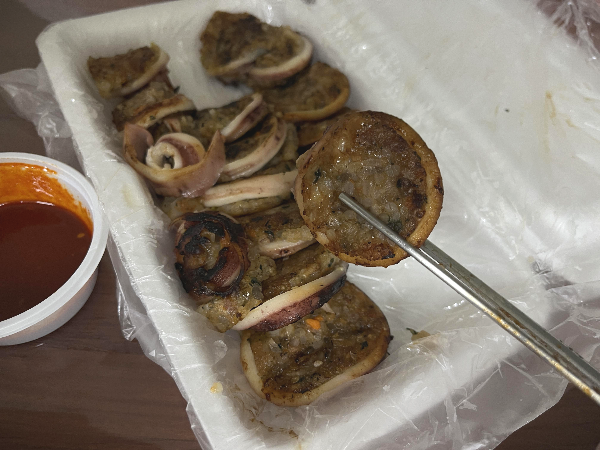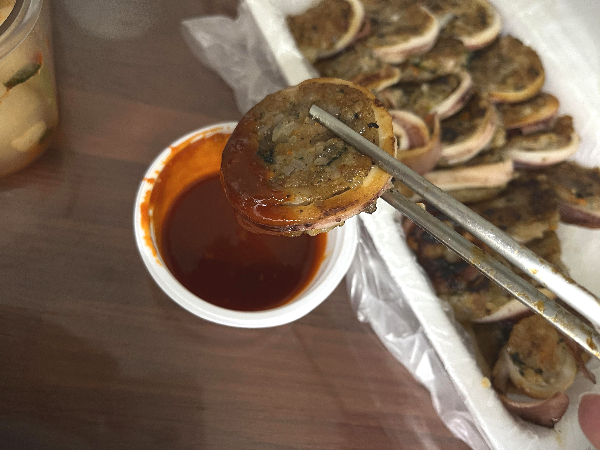 초장소스도 찍어먹어보았습니다. 오징어 때문에 초장이 어울릴 것 같았지만 찹쌀 쫀득한 맛이 더 강해서 초장보다는 그냥 먹는게 더 맛있게 느껴졌습니다.