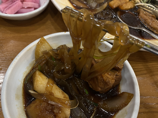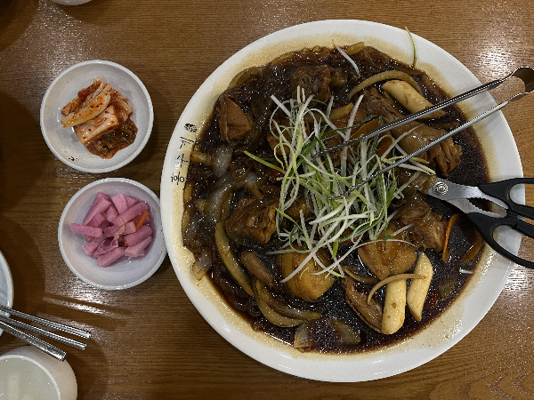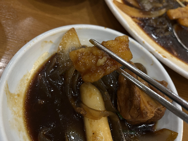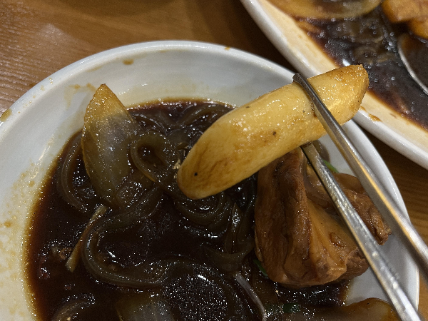 부들부들한 굵은 당면도 먹어보았습니다. 찜닭하면 이 굵은 당면을 빼놓을 수가 없는데요. 부족한 양을 채워주기도 하고 단짠단짠의 양념 그대로 맛이 느껴져서 맛있었습니다.