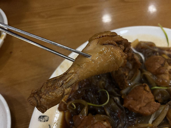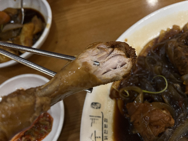 닭다리를 먼저 집어보았습니다. 찜닭 양념이 잘 배어있는 것 같습니다.