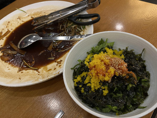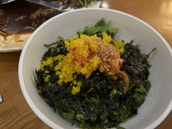 찜닭을 다 먹고나서 셀프비빔밥을 주문하였습니다. 밥 위에 상추와 김가루와 단무지 그리고 김치가 올려져 있습니다.