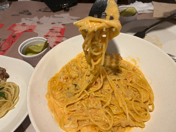 쉬림프 로제 파스타를 먹어보았습니다. 보기와는 다르게 맛있었습니다. 기름기가 살짝 있어서 꾸덕하지 않고 부드럽고 새우가 작아서 부드러운 맛에 잘 어울렸습니다.