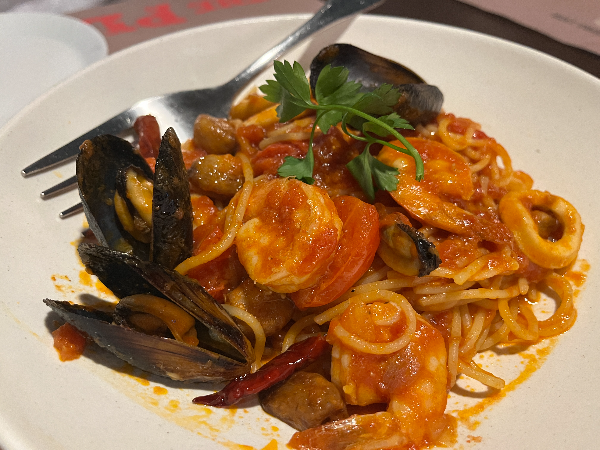 새우, 오징어, 홍합 등 해산물이 들어간 매콤한 파스타입니다.