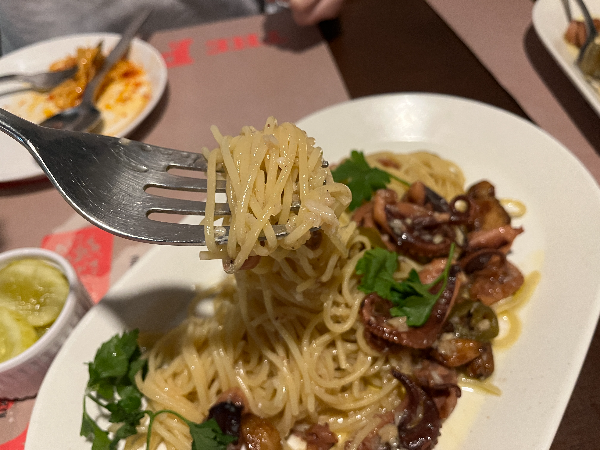 먼저 파스타 면을 먹어 보았습니다. 쭈꾸미의 풍미가 면과 기름에 흠뻑 묻어 있었습니다. 쭈꾸미의 특유의 향이 조금 호불호가 있을지 모르겠는데요.