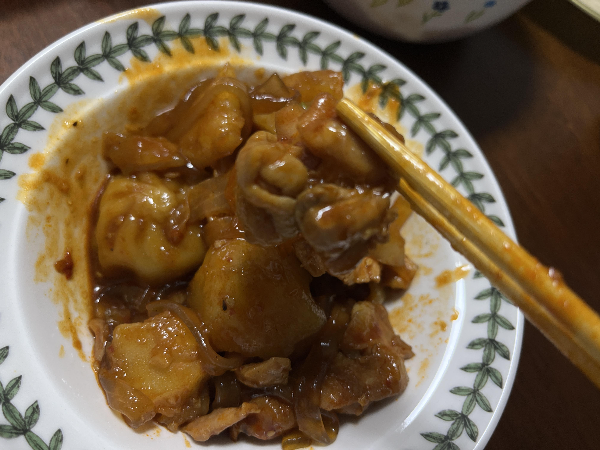 순살로 주문한 닭고기도 먹어보았습니다. 주로 철판 닭갈비에 들어있는 닭고기와 비슷한 모양새였는데요. 쫄깃하고 맛있었습니다. 간장베이스의 단짠의 맛도 있고 살짝 매콤하면서 입맛을 당기는 소스의 맛이 굉장히 적절하게 분배되어 있는 듯한 맛이었습니다.