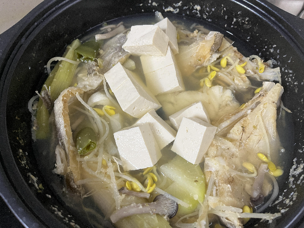 든든하게 하얀 두부도 조금 넣어주고 너무 익어서 대구살이 부서지지 않게끔 10~15분 정도 끓여주었습니다.