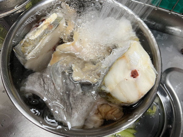 물이 끓는 동안에 냉동 대구는 자연해동을 시켜줍니다.