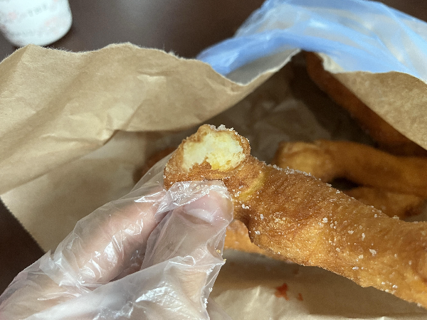 찹쌀꽈배기여서 겉은 바삭하지만 속은 쫀득한게 느껴졌습니다. 꽈배기의 쫀득한 맛은 얼핏 반죽이 안익은 것 같은 느낌이 들기도하지만 생밀찹쌀 맛은 아니니까 잘 익었다고 생각했습니다.