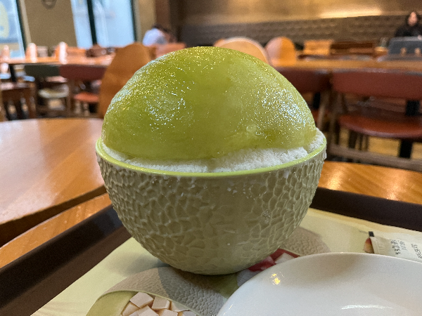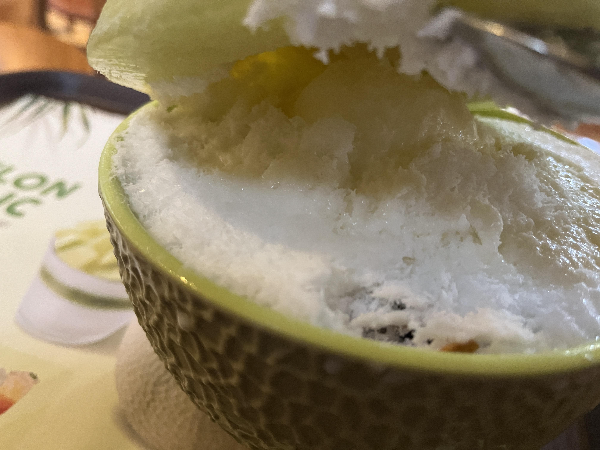 멜론 속에는 어떻게 되어있는지 궁금해서 한번 들춰보았습니다. 하얀 빙수와 연유 아이스크림이 덮여있었는데요. 메론을 얼른 먹고 먹어봐야겠습니다.
