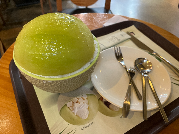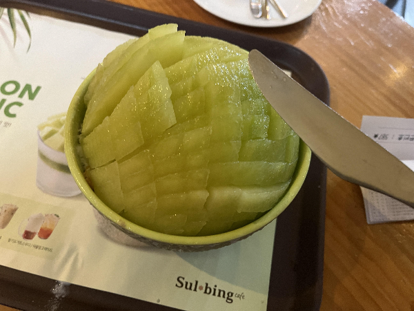 메론을 어떻게 먹어야할까 고민했는데 칼도 같이 나온 것으로보니 잘 잘라먹으라고 한 것 같아서 모양은 제 멋대로 먹기좋게 갈기갈기 조각을 내어보았습니다.