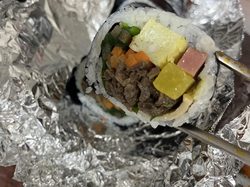 다음은 소고기김밥입니다. 기본 채소에 소고기가 듬뿍 들어있습니다. 기본의 봉봉김밥보다 크기도 살짝 컸습니다. 소고기의 간이 잘 되어 있어서 한입 먹었을때 감칠맛이 확 돌고 구미가 확 당기는 맛이었습니다. 함께 들어있는 깻잎과도 잘 어울리고 맛있었습니다.