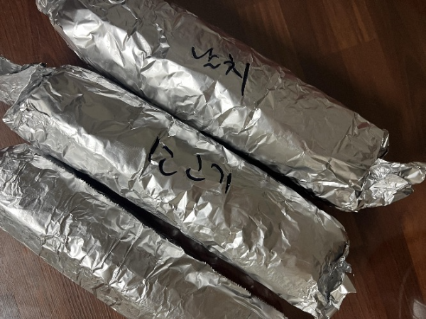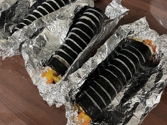 김밥 각 한줄씩 은박지 포장으로 헷갈리지 않게 글씨를 적어주셨습니다.