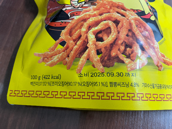 원재료는 페루, 칠레, 중국 등 외국산의 조미오징어를 사용하였고 튀김에 사용한 밀가루와 전분도 모두 외국산입니다. 짬뽕맛의 시즈닝에는 후추와 마늘이 함유되어 있네요.