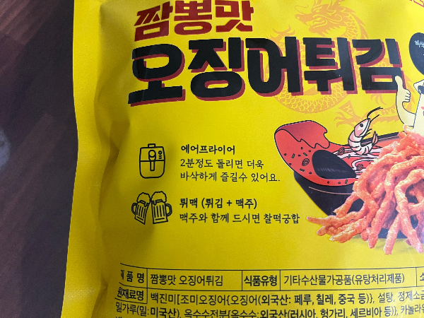 자주 먹던 맛나요오튀 제품은 전자렌지에 20초 돌려주면 되었는데요. 짬뽕맛 오징어튀김 제품은 에어프라이어에 2분 정도 돌리면 된다고 하네요. 그런데 몇 도에 돌리라는 건 없어서 그냥 180도에 돌려주었습니다.