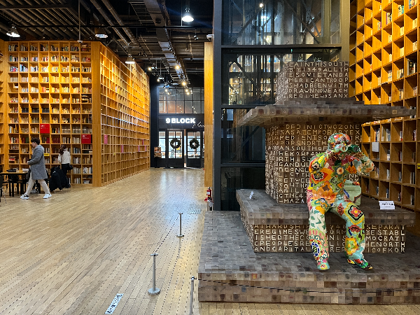 9BLOCK에 들어서자마자 길게 뻗은 공간에 높은 층고와 세련된 인테리어 그리고 넓은 창의 채광의 분위기에 감탄했습니다. 넓고 쾌적한 공간은 독서나 작업을 하기에도 좋고 특히 해가 질 무렵이었는데 자연광이 잘 들어와서 기분이 좋았습니다.