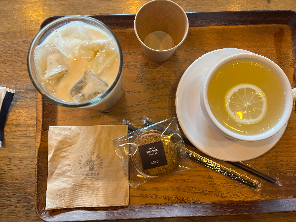 아이스 카라멜 마끼아또와 따뜻한 레몬차 그리고 이벤트로 받은 월넛가레트 쿠키입니다.