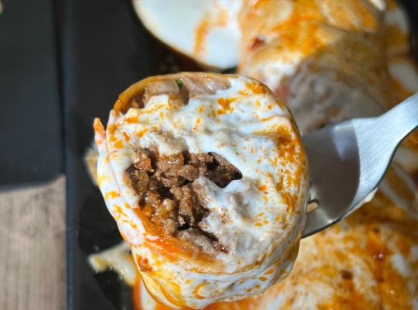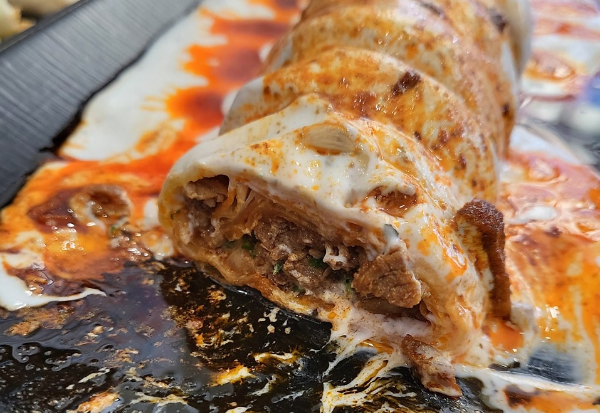 먹기 좋게 잘 잘라져 있었는데요. 그 속에는 고기가 가득 꽉 차 있었습니다. 속은 따뜻하면서 겉은 요거트의 시원함과 크리미하고 상큼한 산미가 더해지니 고소하고 부드러운 맛이었습니다.