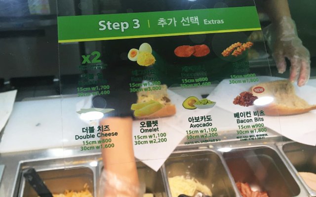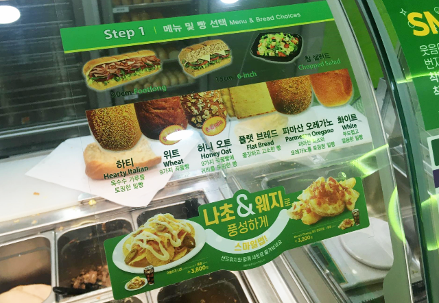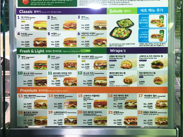 메뉴판을 보고 먹고 싶은 샌드위치를 고릅니다. 저는 프리미엄(풍부한 재료가 만들어내는 든든한 맛) 13 치킨 데리야끼(15cm), 친구는 프레쉬 앤 라이트(저칼로리로 맛과 영양을 동시에) 12 로스트 치킨(15cm)을 선택했습니다. 메뉴를 고르면 빵 길이를 고르는데 배불리 많이 먹을게 아니면 보통 15cm로 먹습니다. 이제부터 본격적인 재미있는 주문하기입니다~!