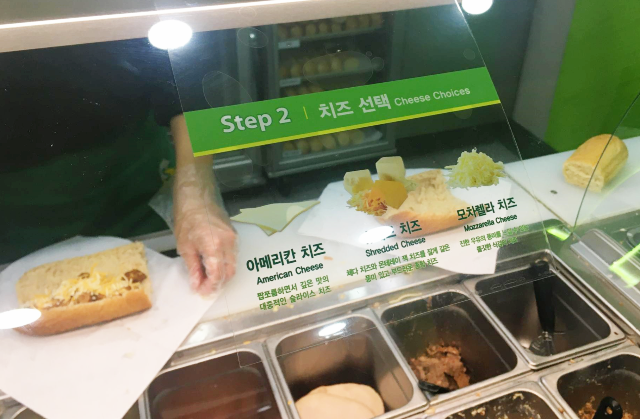 저는(13 치킨 데리야끼) 슈레드 치즈(체다 치즈와 몬테레이 잭 치즈를 잘게 갈은 풍미 있고 부드러운 혼합 치즈)를 선택하고 친구는(12 로스트 치킨) 넣지 않았습니다. 안 넣어도 가격은 내려가지 않습니다. 치즈까지 넣은 상태에서 빵을 따뜻하게 데울지 물어봅니다. 친구와 저는 조금만 따뜻하게 해달라고 했습니다. 그럼 알아서 적당히 데워줍니다. 그냥 먹는 것보다 빵 데워먹는게 훨씬 부드럽고 맛이 좋습니다.