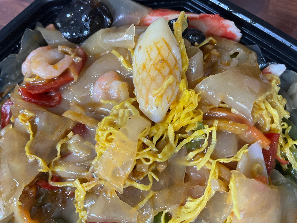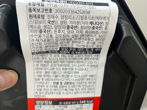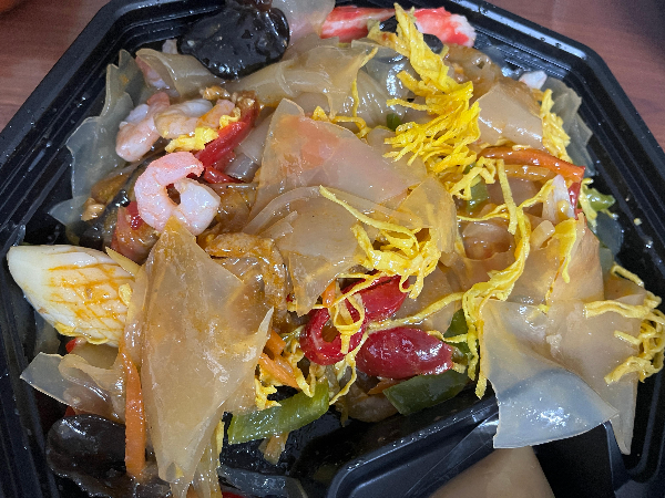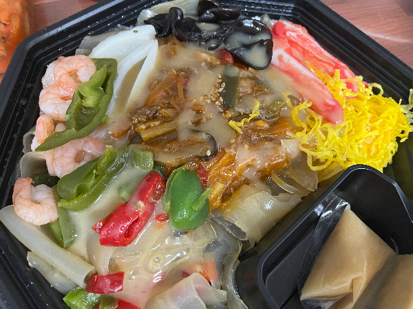 뒷면에 나와있는 원재료명을 살펴보았습니다. 양장피, 피망 등 중국산을 사용하고 있었습니다. 재료에는 갑오징어, 목이버섯, 피망, 게맛살, 계란지단, 새우 등 은근 푸짐하게 들어 있는 것 같습니다.