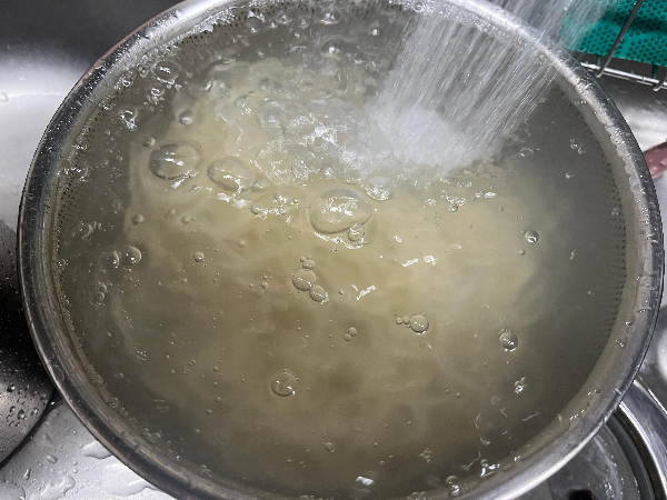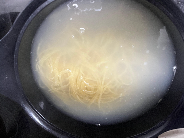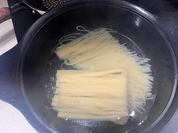 면이 익으면 찬물에 3~4회 정도 헹궈줍니다. 주정처리가 되어있는 숙면이므로 깨끗하게 헹궈주면 더 좋습니다.