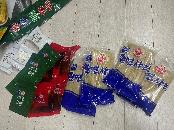 봉지를 뜯어서 내용물을 확인해보았습니다. 4인분으로 쫄면사리, 건조고명, 건더기블럭, 다대기양념장, 소스 등이 4개씩 들어있습니다.