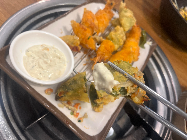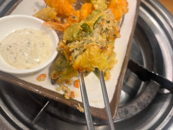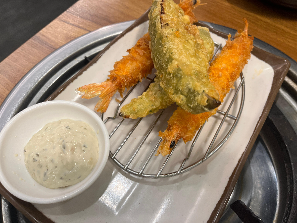 반반튀김입니다. 고추튀김과 새우튀김이 2개씩 나왔습니다.