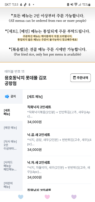 저희는 이미 메뉴를 정하고 들어왔기 때문에 고민도 없이 직화낙지 2인세트 (직화낙지볶음+반반튀김)로 주문하였습니다. 아내 분이 캡처까지해서 저에게 보내주셨습니다.